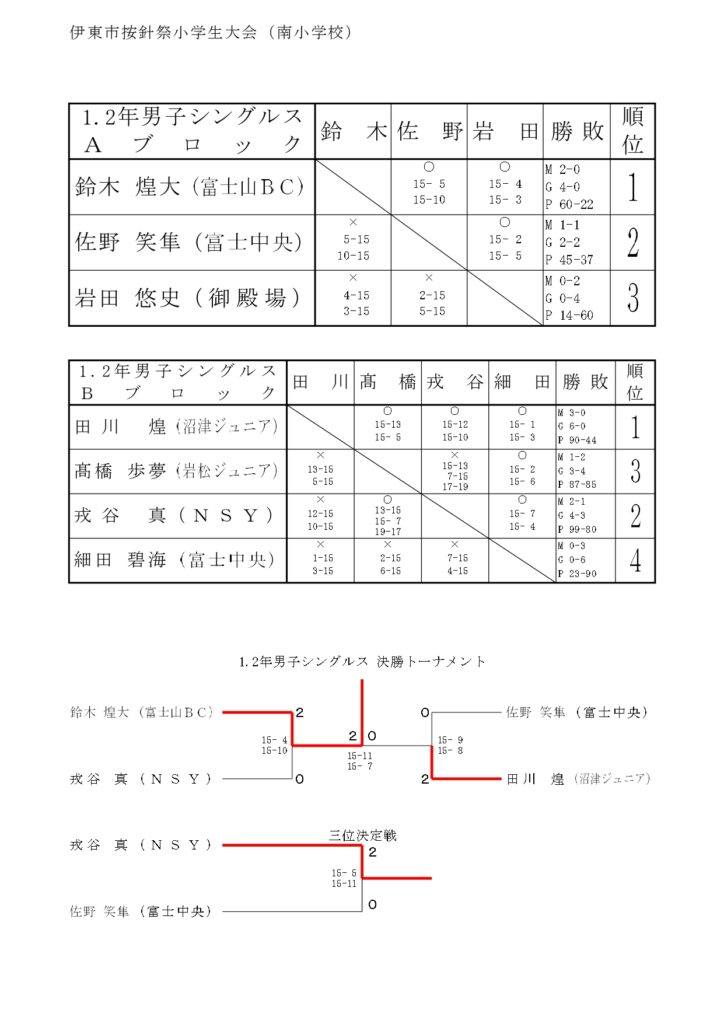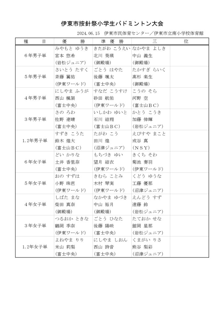 令和6年度 按針祭小学生バドミントン大会 結果 2024 6/19 大会結果 2024年6月19日 令和6年6月15日(土)に伊東市民体育センター及び伊東南小学校体育館にて按針祭小学生バドミントン大会が開催されました。結果は以下のとおりです。 大会結果 よかったらシェアしてね! URLをコピーしました! 第21回IAS杯バドミントン大会結果 令和6年度伊東市按針祭バドミントン大会開催のお知らせ 関連記事 令和7年度 伊東市スポーツ祭バドミントン大会結果 2025年10月26日 令和7年度 伊東市スポーツ祭小学生バドミントン大会結果 2025年10月25日 第17回伊東市シニアバドミントンフェスティバル結果 2025年9月23日 令和7年度 按針祭バドミントン大会結果 2025年8月24日 令和7年度 伊東市按針祭小学生バドミントン大会結果 2025年6月24日 第22回IAS杯バドミントン大会結果 2025年6月19日 第50回伊東市総合選手権大会結果 2025年4月7日 第22回IAS杯ミックスバドミントン大会結果 2025年1月25日