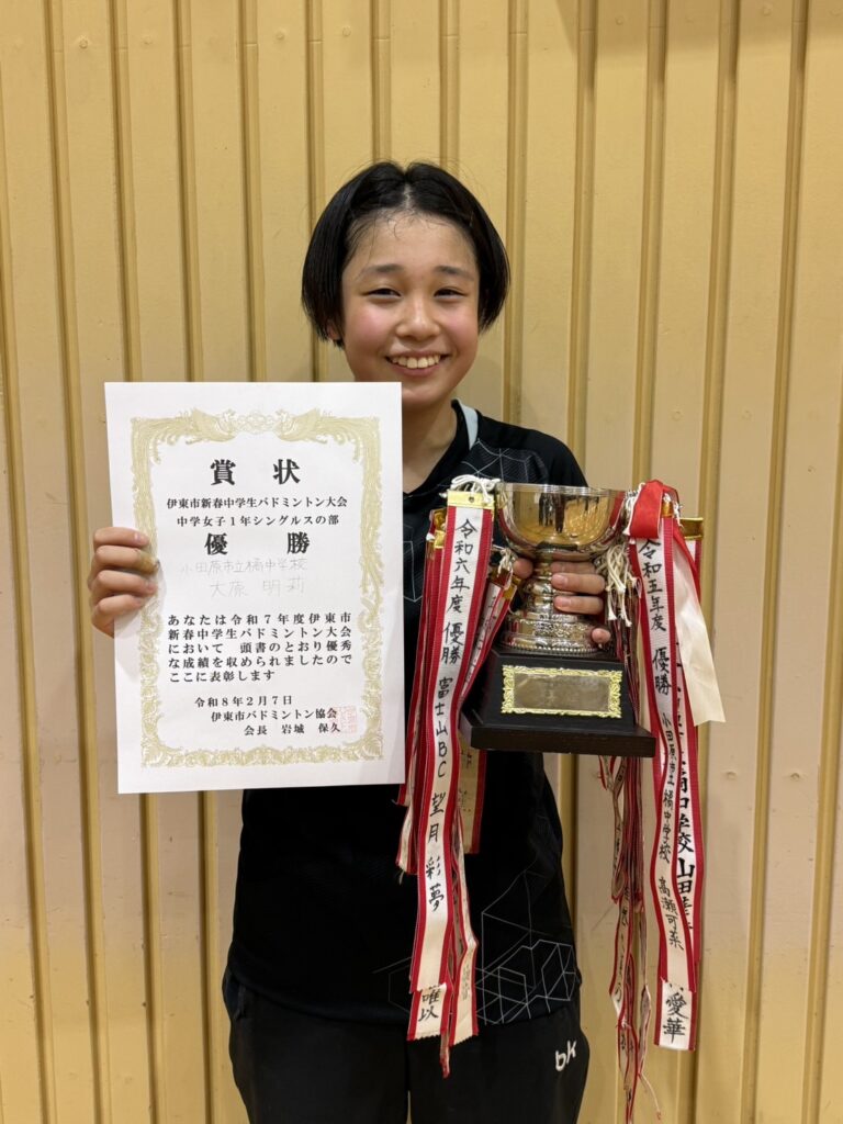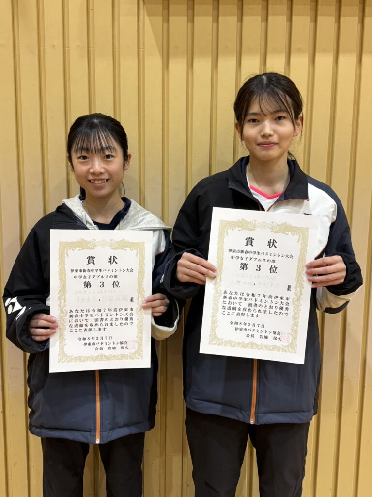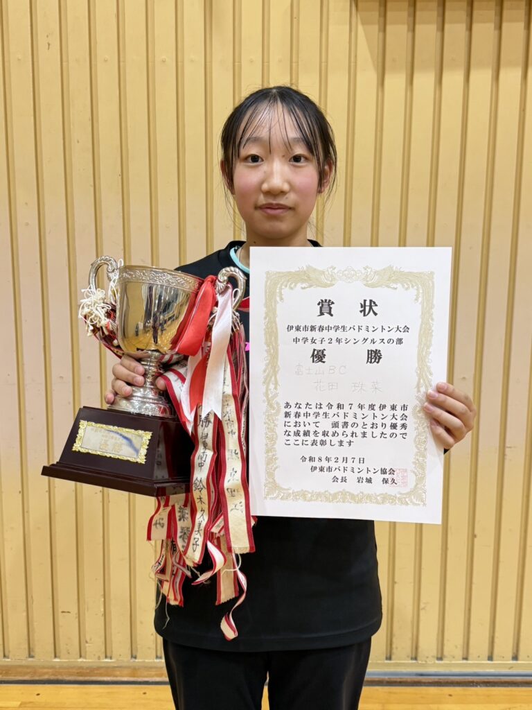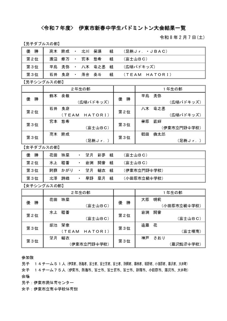 令和7年度 伊東市新春中学生バドミントン大会 結果 2026 2/12 大会結果 2026年2月12日 令和7年2月7日(土)に伊東市民体育センター及び伊東市立南中学校体育館にて令和7年度伊東市新春中学生バドミントン大会が開催されました。結果は以下のとおりです。 大会結果 よかったらシェアしてね! URLをコピーしました! 第22回 IAS杯ミックスバドミントン大会結果 関連記事 第22回 IAS杯ミックスバドミントン大会結果 2026年1月19日 令和7年度 伊東市スポーツ祭バドミントン大会結果 2025年10月26日 令和7年度 伊東市スポーツ祭小学生バドミントン大会結果 2025年10月25日 第17回伊東市シニアバドミントンフェスティバル結果 2025年9月23日 令和7年度 按針祭バドミントン大会結果 2025年8月24日 令和7年度 伊東市按針祭小学生バドミントン大会結果 2025年6月24日 第22回IAS杯バドミントン大会結果 2025年6月19日 第50回伊東市総合選手権大会結果 2025年4月7日