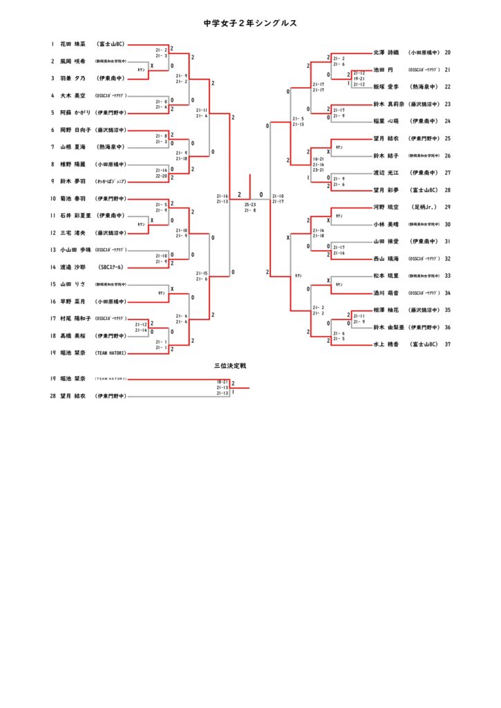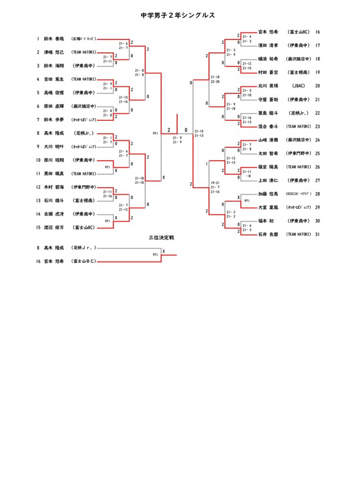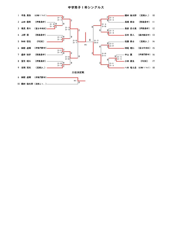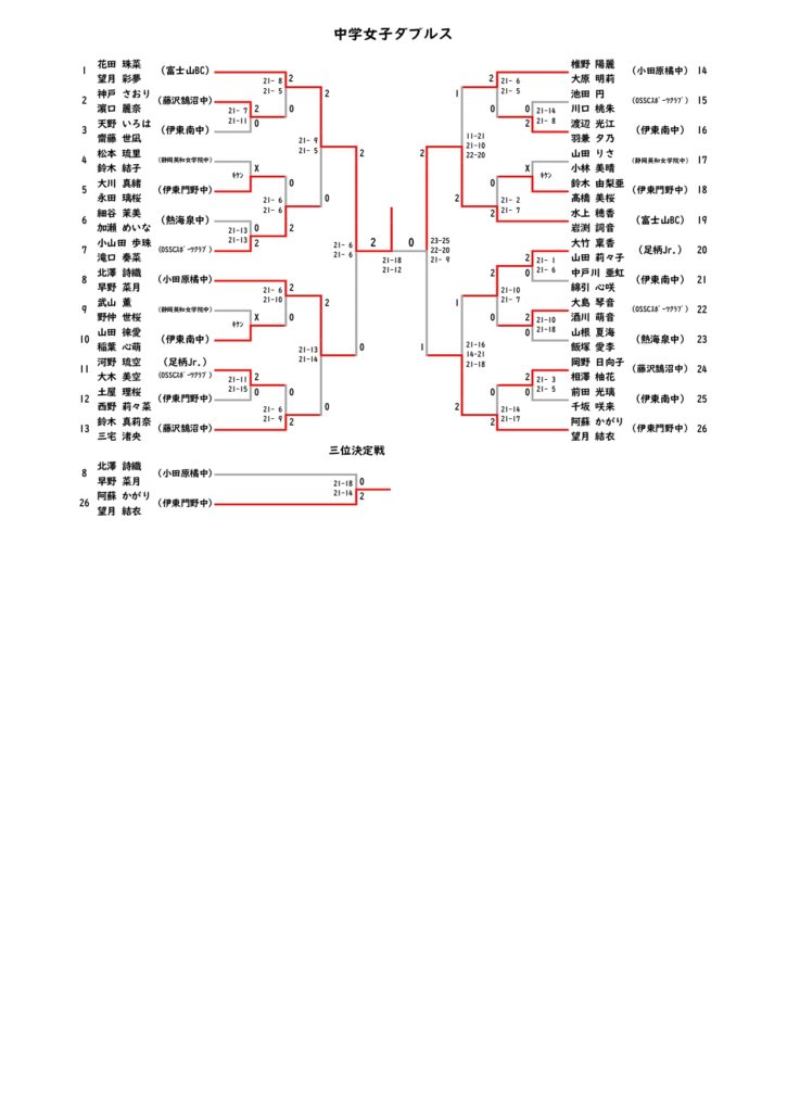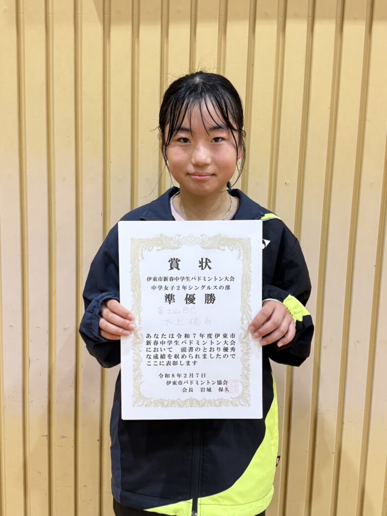 令和7年度 伊東市新春中学生バドミントン大会 結果 2026 2/12 大会結果 2026年2月12日 令和7年2月7日(土)に伊東市民体育センター及び伊東市立南中学校体育館にて令和7年度伊東市新春中学生バドミントン大会が開催されました。結果は以下のとおりです。 大会結果 よかったらシェアしてね! URLをコピーしました! 第22回 IAS杯ミックスバドミントン大会結果 関連記事 第22回 IAS杯ミックスバドミントン大会結果 2026年1月19日 令和7年度 伊東市スポーツ祭バドミントン大会結果 2025年10月26日 令和7年度 伊東市スポーツ祭小学生バドミントン大会結果 2025年10月25日 第17回伊東市シニアバドミントンフェスティバル結果 2025年9月23日 令和7年度 按針祭バドミントン大会結果 2025年8月24日 令和7年度 伊東市按針祭小学生バドミントン大会結果 2025年6月24日 第22回IAS杯バドミントン大会結果 2025年6月19日 第50回伊東市総合選手権大会結果 2025年4月7日