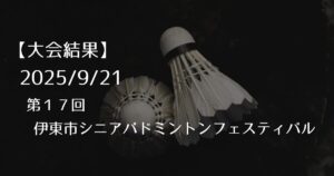 令和7年度 伊東市按針祭小学生バドミントン大会結果 2025 6/24 大会結果 2025年6月24日 令和7年6月14日(土)に伊東市民体育センター及び伊東南小学校体育館にて、令和7年度 伊東市按針祭小学生バドミントン大会が開催されました。結果は以下の通りです。 大会結果 よかったらシェアしてね! URLをコピーしました! 第22回IAS杯バドミントン大会結果 令和7年度 伊東市按針祭バドミントン大会開催のお知らせ 関連記事 第17回伊東市シニアバドミントンフェスティバル結果 2025年9月23日 令和7年度 按針祭バドミントン大会結果 2025年8月24日 第22回IAS杯バドミントン大会結果 2025年6月19日 第50回伊東市総合選手権大会結果 2025年4月7日 第22回IAS杯ミックスバドミントン大会結果 2025年1月25日 令和6年度 スポーツ祭協賛 小学生バドミントン大会結果 2024年10月22日 第16回伊東市シニアバドミントンフェスティバル結果 2024年9月19日 令和6年度伊東市按針祭バドミントン大会結果 2024年9月13日